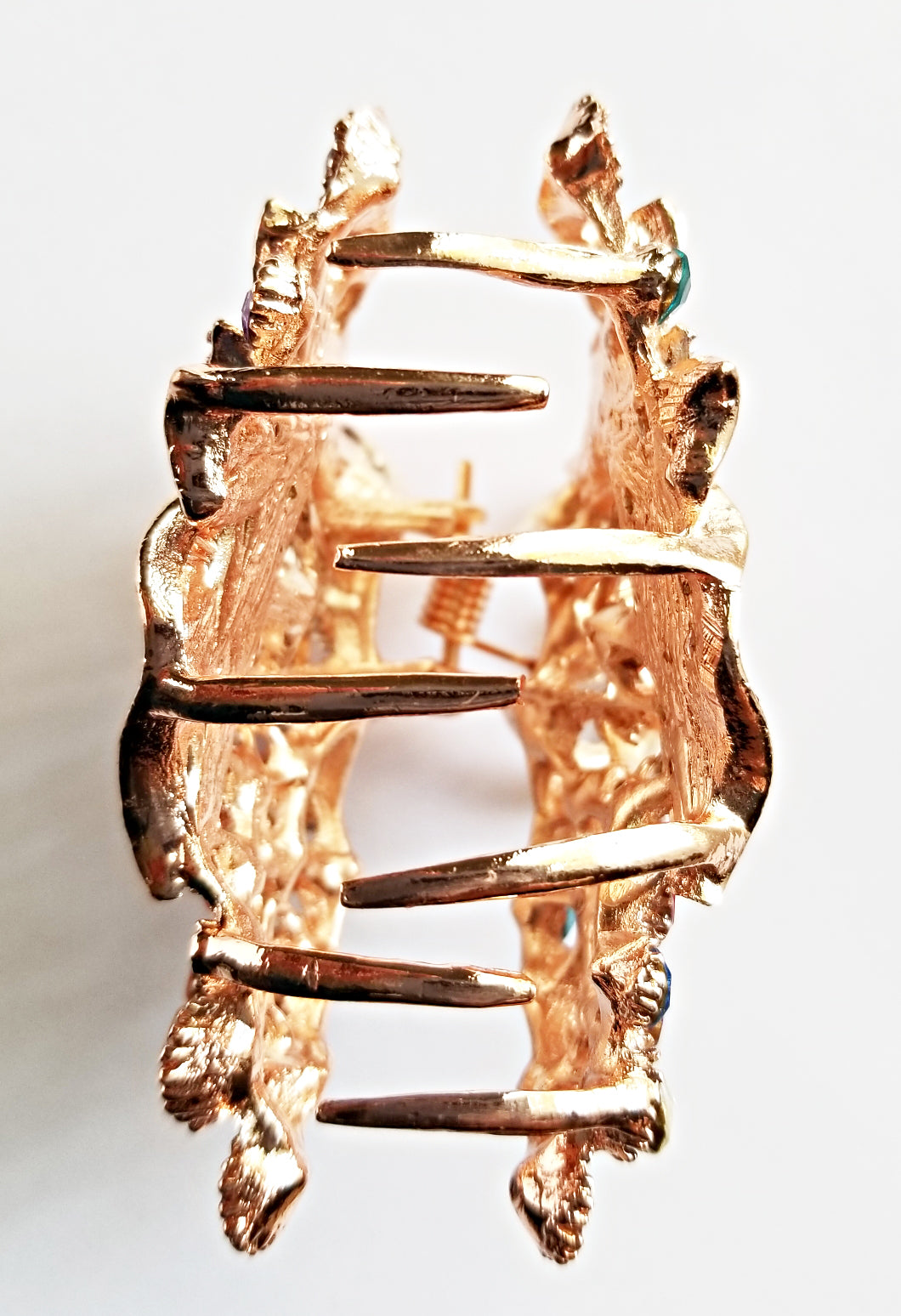 Hair clip is made from metal and rhinestones.